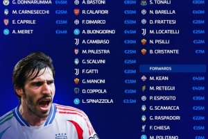 后衛(wèi):巴斯托尼(8000萬歐)、卡拉菲奧里(5000萬歐)、迪馬爾科(5000萬歐)、布翁喬爾諾(4500萬歐)、坎比亞索(3000萬歐)、斯卡爾維尼(2500萬歐)、帕萊斯特拉(2500萬歐)、加蒂(2000萬歐)、曼奇尼(1500萬歐)、迭戈·庫博拉(1000萬歐)、斯皮納佐拉(350萬歐)