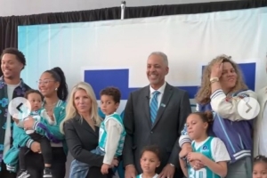 “我非常高興父親能獲得這份榮譽(yù),不僅僅因?yàn)樗乔癗BA球員,讓我有機(jī)會(huì)目睹他的每一個(gè)動(dòng)作,更因?yàn)樗且晃唤涛掖蚯虻母赣H,甚至比我本人還要愛(ài)籃球。他向我展示了成為一名真正的職業(yè)球員的意義,以及如何通過(guò)努力贏得這一切。所以,籃球?qū)τ谖覀兗易鍋?lái)說(shuō)就是重要的一部分。今天能夠和我的兄弟(賽斯)一起出席儀式,對(duì)我來(lái)說(shuō)意義重大。顯然,庫(kù)里家族的歷史與夏洛特緊密相連,而30號(hào)球衣以后將永被銘記,這對(duì)我們來(lái)說(shuō)意味著所有。這也是我的父親仍然住在這里的原因,這里依然是我們的家?!睅?kù)里表示。