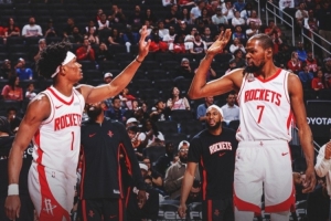 賽后火箭官推發(fā)布贏球海報(bào),封面是阿門(mén)和杜蘭特?fù)粽扑查g。
