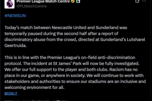 “此舉符合英超聯(lián)賽的場(chǎng)上反歧視協(xié)議。圣詹姆斯公園球場(chǎng)發(fā)生的這起事件現(xiàn)在將接受全面調(diào)查。我們向該球員及兩家俱樂部提供全力支持。種族主義在我們的比賽中、或社會(huì)任何角落都絕無(wú)立足之地。我們將繼續(xù)與各利益相關(guān)方及當(dāng)局合作,確保我們的球場(chǎng)成為一個(gè)對(duì)所有人極具包容性且受歡迎的環(huán)境?!?/p>