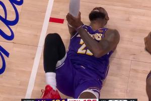 GIF-燃盡了!詹姆斯先連續(xù)防守又全力沖刺上籃被犯規(guī) 手肘再次受傷!