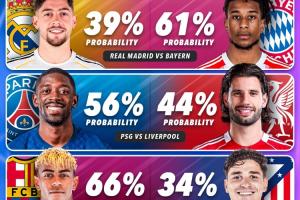歐冠1/4決賽晉級概率: