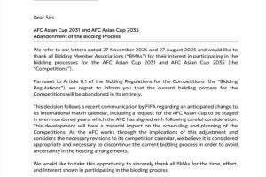 此變化將對(duì)賽事的日程安排和規(guī)劃產(chǎn)生重大影響。鑒于亞足聯(lián)正在梳理這一調(diào)整的影響,并考慮對(duì)賽事日歷進(jìn)行必要修訂,我們認(rèn)為:為避免辦賽安排的不確定性,終止當(dāng)前申辦流程是恰當(dāng)且必要的。
