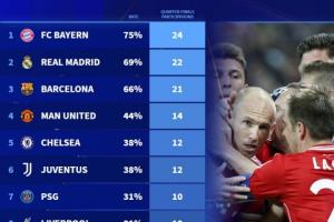 體育資訊03月19日訊 歐冠八強已經全部產生,德轉統(tǒng)計了各球隊自1994/95賽季起參加歐冠1/4決賽的次數,其中,拜仁、皇馬、巴薩位居前三,曼聯(lián)第四。