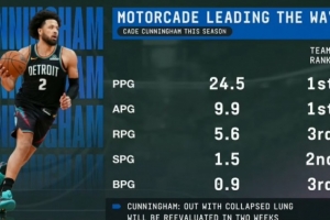 活塞官方:坎寧安患有左側(cè)肺氣胸 將在兩周后重新接受復(fù)查