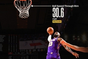 根據(jù)統(tǒng)計(jì),詹姆斯的這記勢大力沉的扣籃起跳距離為3.2米,籃球穿越籃筐的速度為49.2公里/小時(shí)。