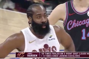 騎士VS公牛,哈登首節(jié)兩次打成3+1,轉(zhuǎn)播方曬統(tǒng)計(jì):哈登本賽季50次造成三分球犯規(guī)領(lǐng)跑全聯(lián)盟,加入騎士之后已經(jīng)9次。